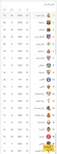 هاي كورة : بعد مرور 12 جولة من الدوري الإسباني ، يتصدر ريال مدريد جدول ترتيب البطولة بفارق ثلاث نقاط فقط عن غريمه التقليدي نادي برشلونة صاحب المركز الثاني .