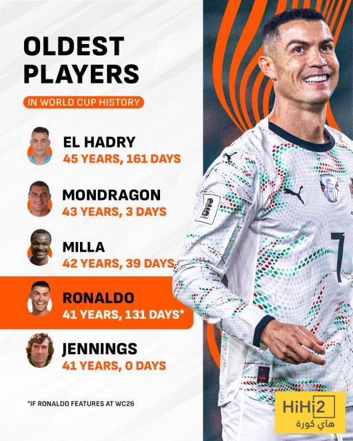 وأكد موقع لايف سكور أن رونالدو سيكون أكبر ثالث لاعب يشارك في تاريخ المونديال بعمر الـ 40 و131 يوم .