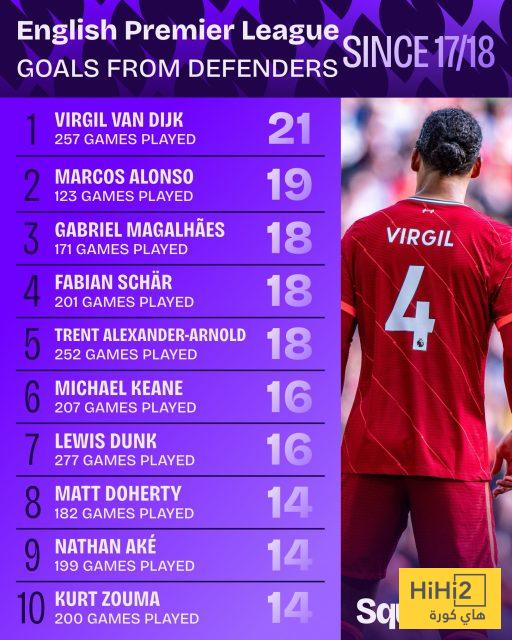 وجاء فيرجيل فان دايك مدافع ليفربول في الصدراة حيث سجل 21 هدفًا ، يليه ماركوس ألونسو ، ثم غابرييل نجم أرسنال .