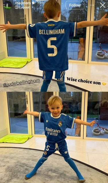 هاي كورة- نشر لاعب وسط توتنهام والمنتخب الإنجليزي جيمس ماديسون صورة لابنه الأكبر، ليو، عبر حسابه على إنستجرام وهو يرتدي قميص ريال مدريد .