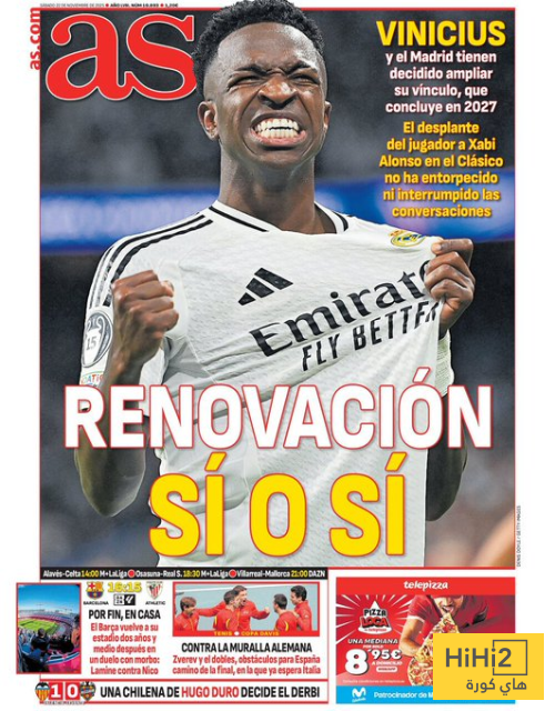 هاي كورة – سلطت صحيفة أس الاسبانية الضوء على عملية تجديد عقد فينيسيوس جونيور مع ريال مدريد حيث تصدر البرازيلي غلاف الصحيفة اليوم السبت 22 نوفمبر 2025 .