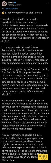 لقد تأخر عن الحضور، لكنه يمتلك قوة كافية لإقناع شريحة كبيرة من جماهيره. لا أدري إن كان يشعر بذلك حقًا، أم أن خطابه الجريء، الذي ألقاه فريقه الأكثر تشددًا، يهدف إلى إقناع الأعضاء بما هو أهم للنادي: تغيير النموذج الذي سيقترحه في فبراير .. لكنه اليوم أظهر لريال مدريد حقيقته، مُثبتًا أن الرقي يعني أيضًا الدفاع عن الحق “.