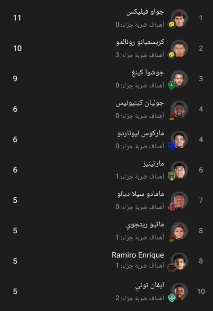 قائمة هدافي دوري روشن بعد نهاية الجولة التاسعة