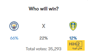 نسبة فوز مانشستر سيتي تصل 66% ، مقابل 12% لليدز ، أما التعادل 22% .