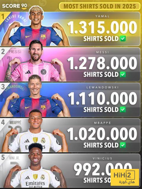 هاي كورة- نشر موقع سكور 90 قائمة الاقمصة الخمسة الخاصة باللاعبين الاكثر مبيعا و رواجا في العالم خلال العام 2025.