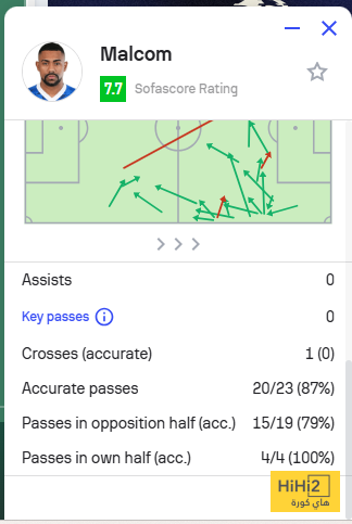 هاي كورة : قدم مالكوم أداءً لافتًا في الشوط الأول أمام الفتح، حيث ظهر بحضور هجومي قوي وتحرك فعال بين الخطوط، ما جعل تقييمه في Sofascore يعكس تميّزه داخل الملعب.