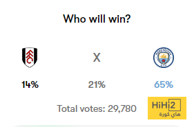 نسبة فوز مانشستر سيتي تصل 65% ، مقابل 14% لفولهام ، أما التعادل 21% .