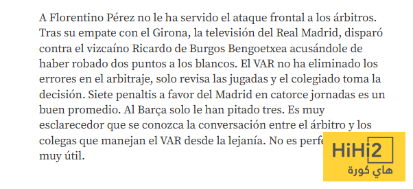 لم يُفلح هجوم فلورنتينو بيريز المباشر على الحكام . بعد تعادلهم مع جيرونا ، هاجمت قناة ريال مدريد التلفزيونية الحكم الباسكي ريكاردو دي بورغوس بينغويتشيا ، متهمةً إياه بسرقة نقطتين من الريال . لم يُلغِ نظام الفيديو المساعد (VAR) أخطاء التحكيم ؛ فهو يُراجع فقط اللعبات ، والحكم هو من يتخذ القرار النهائي .