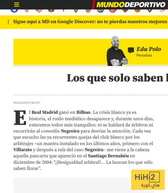 فاز ريال مدريد في بلباو . أصبحت أزمة البرنابيو من الماضي ، وهدأ ضجيج الإعلام ، وسنشعر جميعًا براحة أكبر لبضعة أيام : لن يكون هناك حديث عن الحكام ، ولن يلجأوا إلى كبش فداء نيغريرا لصرف الانتباه . في كل مرة أسمع فيها شكاوى الريال المتكررة بشأن التحكيم ، أتذكر تلك اللافتة التي رُفعت في سانتياغو برنابيو في ديسمبر 2004 : “عدم المساواة في التحكيم؟… يسعى وراءها من لا يعرفون سوى البكاء”.