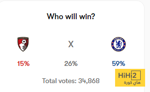 نسبة فوز تشيلسي تصل إلى 59% ، مقابل 15 % لبورنموث ، أما التعادل 26%