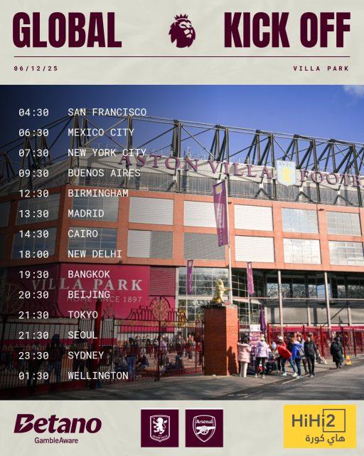 توقيت مباراة ارسنال و استون فيلا في أنحاء العالم :