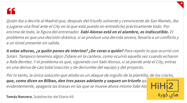 “من كان ليخبر ريال مدريد، بعد فوزه الساحق في سان ماميس، أنه سيخوض نهائيًا ضد مانشستر سيتي حيث كل شيء تقريبًا محل شك؟ قبل كل شيء، منصب المدرب. تشابي ألونسو في موقف حرج، هذا واضح. المشكلة هي أن اتخاذ قرار حاسم، في حال تعرض الفريق لهزيمة ثقيلة، سيؤدي إلى صراع قائم بالفعل، وطريق مسدود.