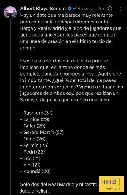 ” هناك إحصائية أعتقد أنها مهمة جدًا لشرح الفرق الرئيسي بين برشلونة وريال مدريد ونوعية لاعبي كل فريق : عدد التمريرات التي تخترق خط الدفاع في الثلث الأخير من الملعب.