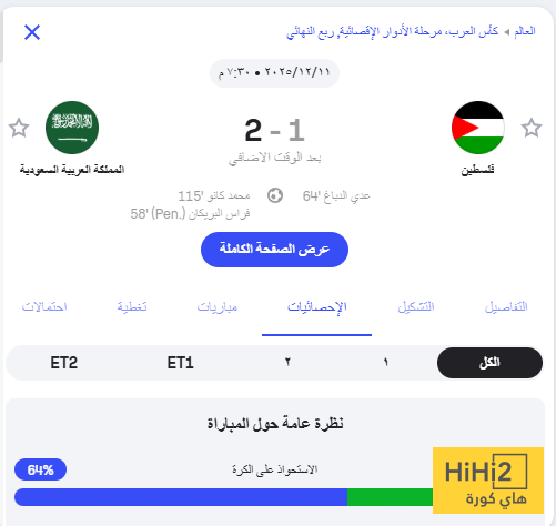 هاي كورة: تفوق المنتخب السعودي على فلسطين في الإحصائيات، خلال مباراة ربع نهائي كأس العرب، والتي انتهت بفوز الأخضر بهدفين مقابل هدف على ستاد لوسيل بقطر، ويتأهل إلى نصف نهائي البطولة. إليكم الإحصائيات: