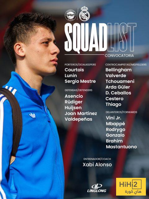 هاي كورة- أعلن تشابي ألونسو مدرب فريق ريال مدريد عن قائمة الفريق لمواجهة ديبورتيفو ألافيس غدا الأحد، في الجولة الـ16 من مسابقة الدوري الاسباني، وشهدت القائمة وجود كيليان مبابي بعد شكوك حول مشاركته.