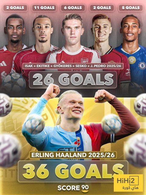 هالاند وحده سجل 36 هدفا في جميع البطولات التي شارك فيها خلال الموسم الحالي بينما المهاجمين الخمسة كلهم سجلوا 26 هدفا فقط بمعدل خمسة اهداف لكل واحد منهم .