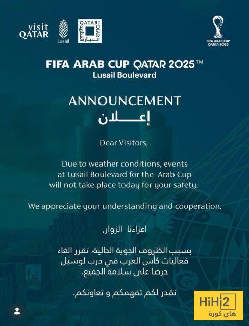 هاي كورة – تأكد رسميًا إلغاء فعاليات درب لوسيل ضمن حفل نهائي كأس العرب 2025 ، بسبب الظروف الجوية الراهنة ، إذ ساهمت الأمطار الغزيرة في جعل إقامة الاحتفالات أمر غير آمن للجمهور واللاعبين ، ما دفع اللجنة المنظمة لهذا القرار .