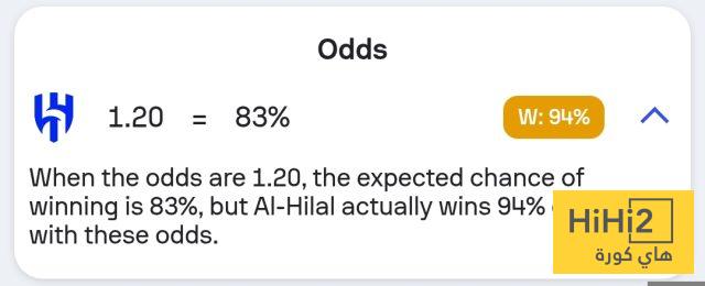 نسبة فوز الهلال في المباراة تصل إلى 94% ، فيما انقسمت الـ 6% المتبقية ما بين التعادل والهزيمة .