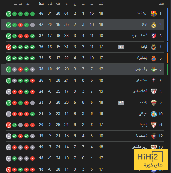 بيتيس في المركز الخامس من ترتيب الدوري الاسباني برصيد 28 نقطة