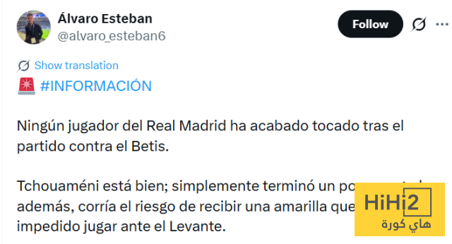 لم يُصب أي لاعب من ريال مدريد في مباراة ريال بيتيس، تشواميني بخير؛ فقد عانى من بعض الشد العضلي، وكان مُعرّضًا لتلقي بطاقة صفراء كانت ستُبعده عن مباراة ليفانتي .