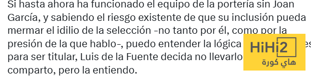 إذا كان أداء حراس المرمى في المنتخب الإسباني جيدًا حتى الآن بدون خوان غارسيا ، ومع العلم باحتمالية أن يؤثر وجوده سلبًا على انسجام الفريق – ليس بسببه تحديدًا ، بل بسبب الضغط الإعلامي الذي يصاحبه الآن – فأنا أتفهم منطق لويس دي لا فوينتي في عدم استدعائه إذا لم يكن من المتوقع أن يكون الحارس الأساسي . لا أتفق مع هذا القرار، لكنني أتفهمه .
