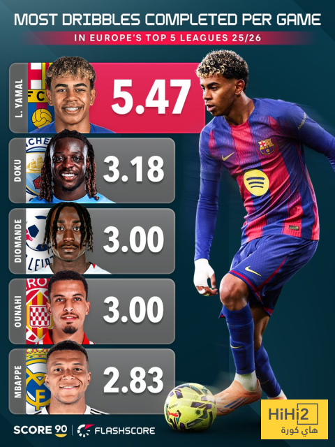 هاي كورة- وفقا لموقع سكور 90 ، يتصدر لامين يامال لاعب برشلونة قائمة أفضل المراوغين في أفضل خمس دوريات أوروبية هذا الموسم .