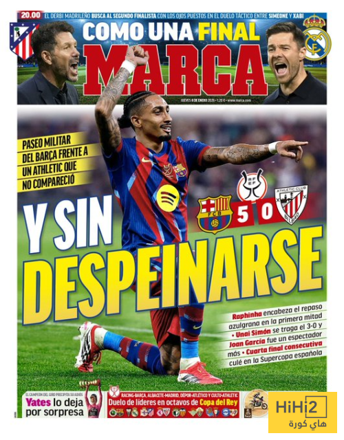 هاي كورة- تصدر فوز برشلونة الكاسح على اتلتيك بيلباو في نصف نهائي السوبر الاسباني غلاف صحيفة ماركا الاسبانية اليوم الخميس 8 يناير 2025 .