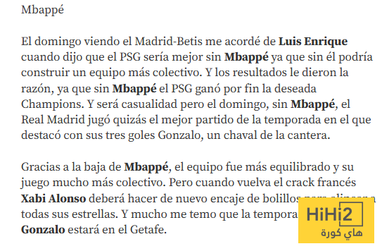 مشاهدة مباراة ريال مدريد وريال بيتيس يوم الأحد ذكّرتني بتصريح لويس إنريكي بأن باريس سان جيرمان سيكون أفضل بدون كيليان مبابي ، إذ سيتمكن من بناء فريق أكثر تماسكًا بدونه. وقد أثبتت النتائج صحة كلامه، حيث فاز باريس سان جيرمان أخيرًا بدوري أبطال أوروبا بدون مبابي . وربما كان الأمر مجرد صدفة ، لكن يوم الأحد ، وبدون الفرنسي ، قدّم ريال مدريد ربما أفضل مباراة له هذا الموسم، وتألق فيها غونزالو، اللاعب الشاب من أكاديمية النادي ، بتسجيله ثلاثية.