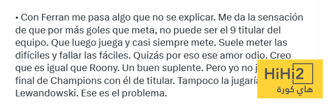 هناك شيءٌ ما في فيران لا أستطيع تفسيره تمامًا . لدي شعورٌ بأنه مهما سجل من أهداف، لا يمكنه أن يكون المهاجم الأساسي للفريق . يلعب، ويكاد يُسجل دائمًا . يميل إلى تسجيل الكرات الصعبة وإضاعة السهلة . ربما لهذا السبب توجد هذه العلاقة المتناقضة بين الحب والكراهية . أعتقد أنه مثل روني ، بديلٌ جيد لكنني لن ألعب نهائي دوري أبطال أوروبا معه كمهاجم أساسي ، ولن ألعبها مع ليفاندوفسكي أيضًا .. هذه هي المشكلة.