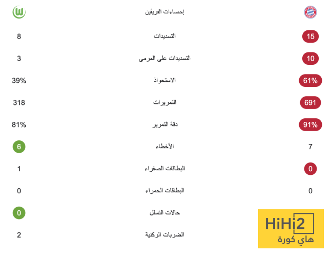 وبهذه النتيجة عزز بايرن ميونخ تواجده في صدارة جدول الترتيب العام برصيد 44 نقطة، بينما توقف رصيد فولفسبورغ عند 15 نقطة في المركز الرابع عشر.