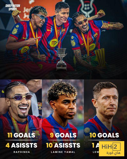 هاي كورة : يواصل ثلاثي برشلونة ، روبرت ليفاندوفسكي ، رافينيا ، لامين يامال تقديم مستويات استثنائية هذا الموسم سواء من خلال تسجيل الأهداف أو التمريرات الحاسمة ، وجاءت ارقامهم كالتالي :