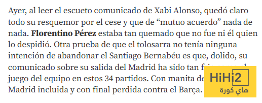 أمس ، أوضح بيان تشابي ألونسو الموجز مدى استيائه من إقالته، وأنه لم يكن هناك أي “اتفاق متبادل” على الإطلاق. ومما يؤكد أن الرجل القادم من تولوسا لم يكن ينوي مغادرة سانتياغو برنابيو ، أن بيانه عن مغادرة مدريد ، والذي بدا عليه الألم بوضوح ، كان باردًا كأداء الفريق في المباريات الـ 34 الأخيرة ، والتي انتهت بخسارة في النهائي أمام برشلونة .