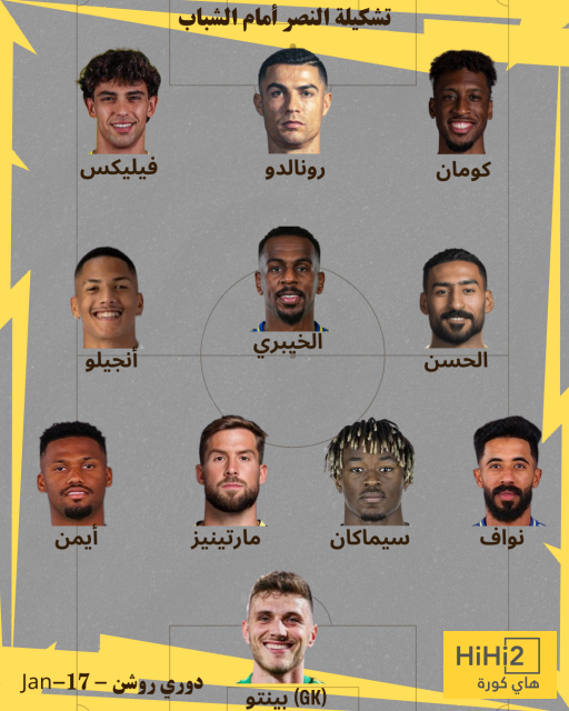 هاي كورة – كشف موقع هاي كورة عن تشكيلة النصر المتوقعة لمواجهة الشباب في دوري روشن السعودي للمحترفين حيث سيلتقي الفريقان مساء السبت وفق التوقيت المدرج في جداول الموقع لكل دولة حول العالم .