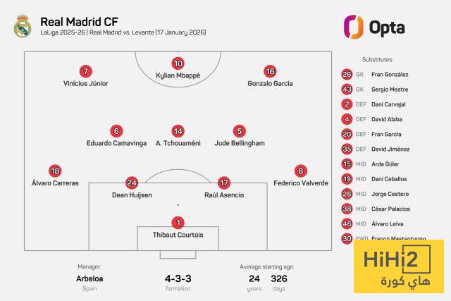 هاي كورة- دفع مدرب ريال مدريد ألفارو أربيلوا بتشكيلة أساسية أمام ليفانتي بمتوسط عمر 24 عامًا و326 يومًا، وهو أصغر متوسط عمر لمدرب ريال مدريد في أول مباراة له في الدوري الإسباني منذ موسم 2003/2004 على الأقل.
