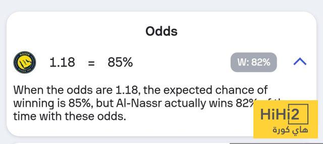 نسبة فوز النصر في المباراة تصل إلى 82% ، فيما انقسمت الـ 18% المتبقية ما بين التعادل والهزيمة