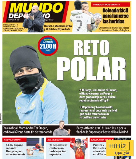 هاي كورة- مواجهة برشلونة أمام سلافيا براغ تصدرت غلاف صحيفة موندو ديبورتيفو الاسبانية اليوم الاربعاء 21 يناير 2026 .