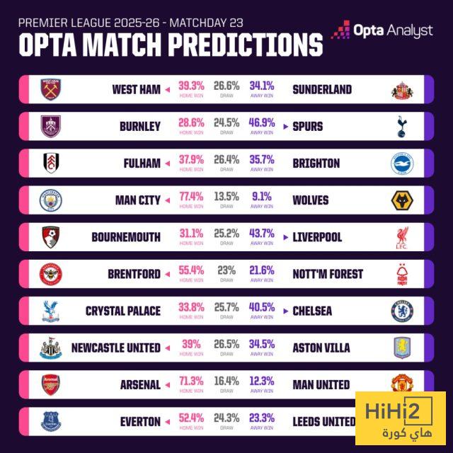 شبكة اوبتا المختصة كشفت عن توقعاتها لنتائج مباريات هذه الجولة حيث منحت حظوظا كاسحة للمتصدر لتعزيز صدارته بفوز جديد من شانه ابعاد اليونايتد عن المركز الرابع .