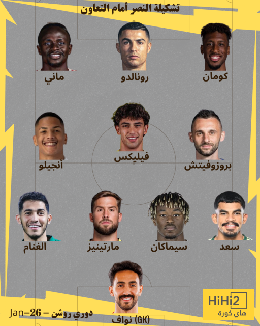 هاي كورة – كشف موقع هاي كورة عن تشكيلة النصر المتوقعة لمواجهة التعاون في دوري روشن السعودي للمحترفين حيث سيلتقي الفريقان مساء الاثنين وفق التوقيت المدرج في جداول الموقع لكل دولة حول العالم .