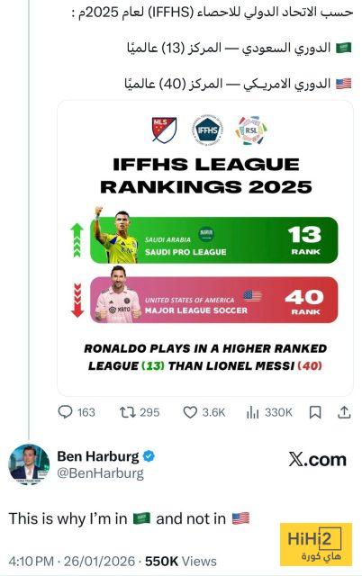 بن هاربورغ قرر الانضمام إلى الدوري السعودي ، الذي يحتل المركز الـ 13 عالميًا حسب الاتحاد الدولي للإحصاء ( IFFHS ) لعام 2025 ، في حين يأتي نظيره الأمريكي في المركز الـ 40 عالميًا ، رغم أنه يضم نخبة من ألمع النجوم العالميين وعلى رأسهم الأرجنتيني ليونيل ميسي .