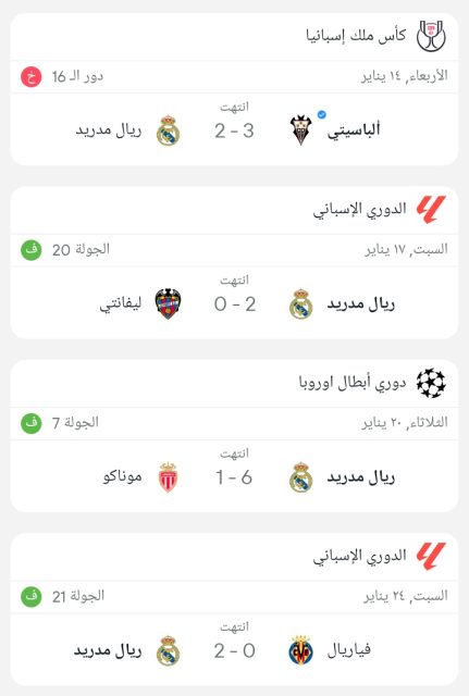 وجاءت نتائج ريال مدريد كالتالي :