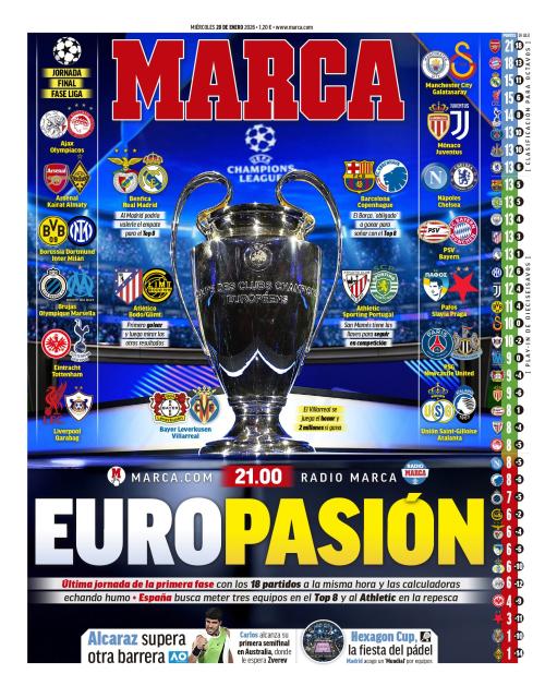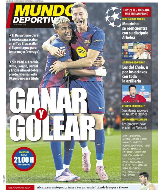 - برشلونة يستقبل كوبنهاغن بهدف إنهاء مرحلة الدوري من دوري الأبطال ضمن الثمانية الأوائل، مع متابعة مواجهة باريس سان جيرمان – نيوكاسل
