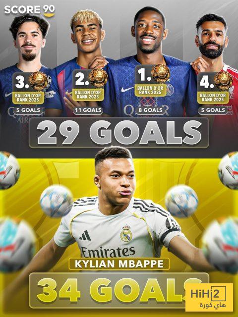 مبابي سجل حتى الان 34 هدفا في كافة البطولات التي شارك فيها فريقه ريال مدريد و هو الرقم الذي يمنحه تفوقا على الرباعي الاول في ترتيب جائزة اللكرة الذهبية و الذي ضم عثمان ديمبلي ، لامين يامال ، فيتينيا و محمد صلاح و جميعهم سجلوا 29 هدفا فقط .