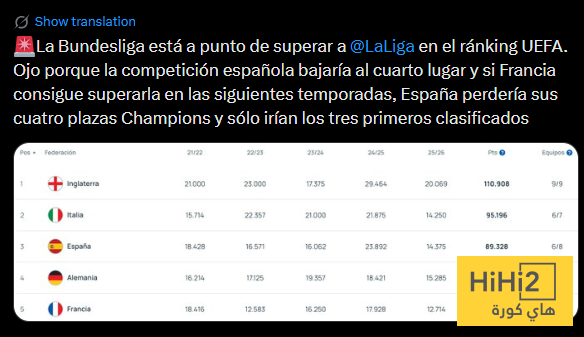 ” يوشك الدوري الالماني على تجاوز الليغا في تصنف الاتحاد الاوروبي لكرة القدم، احذروا ! ، لأن الدوري الاسباني سيتراجع الى المركز الرابع ، واذا تمكن الدوري الفرنسي من تجاوزه في المواسم القادمة ، فستخسر اسبانيا مقاعدها الاربعة في دوري ابطال اوروبا ولن يتأهل سوى الفرق الثلاثة الأولى ” .