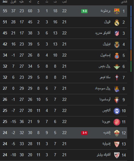 برشلونة عزز صدارته بثلاث نقاط أخرى ووصل الى 55 نقطة في المركز الاول لترتيب الليغا ، بينما تجمد رصيد إلتشي عند النقطة 24 في المركز الـ 12.