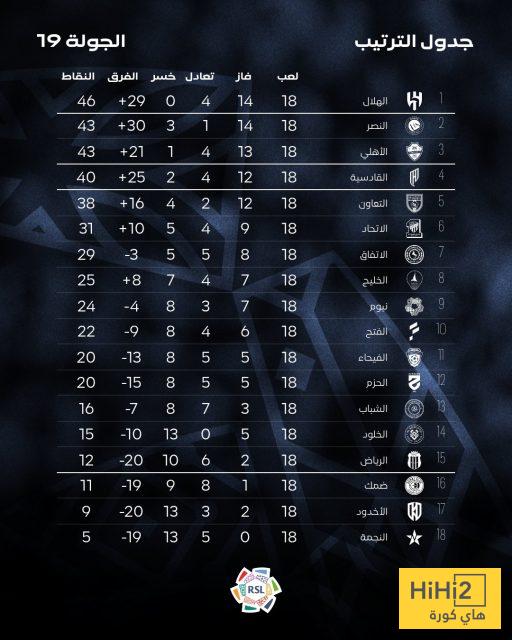 النصر بـ 43 نقطة من أصل 53 ، سجل 48 هدفًا واستقبلت شباكه 18 أخرين .