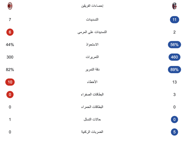 إحصائيات مباراة ميلان وبولونيا في الدوري الإيطالي