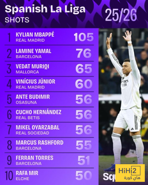 مبابي سدد 29 كرة اكثر من اي لاعب آخر في الدوري الاسباني ، حيث يتصدر الفرنسي القائمة برصيد 105 تسديدة ، ويليه لامين يامال نجم البارسا صاحب الـ 76 تسديدة .