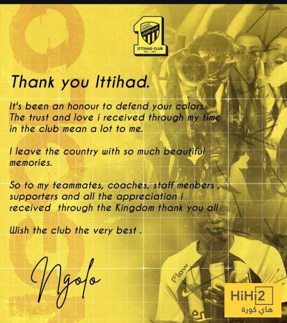 هاي كورة – وجه اللاعب الفرنسي نغولو كانتي رسالة وداعية لنادي الاتحاد وجهازه الفني ولاعبيه وجماهيره المخلصة ، وذلك عقب انتقاله رسميًا إلى صفوف فنربخشة التركي خلال فترة الانتقالات الشتوية ، إذ قال :