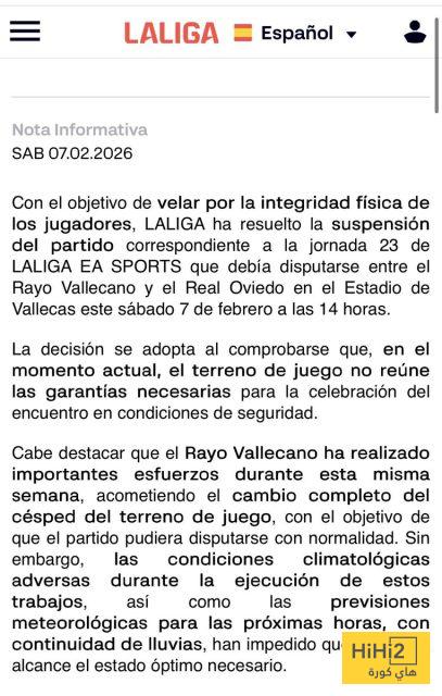 أعلنت رابطة الدوري الإسباني لكرة القدم تأجيل مباراة رايو فاليكانو وريال أوفييدو قبل أربع ساعات من انطلاقها بسبب سوء حالة أرضية ملعب فاليكاس .
