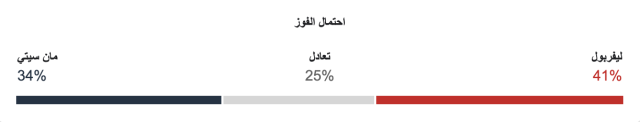 نسبة فوز ليفربول 41%، ونسبة فوز مانشستر سيتي 34%، ونسبة التعادل 25%.